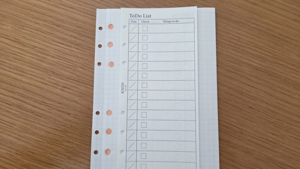 また、KNOX社の純正リフィルと同じ幅を取ってくれるため、紙の端から穴の中心が5㎜の位置に来ている。