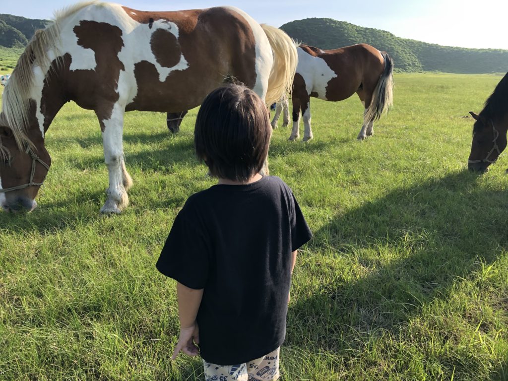 草千里を歩いて、馬の近くへいくことにしました。