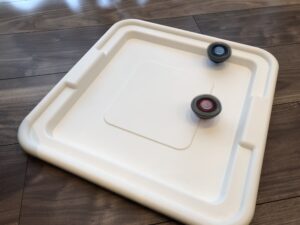 ニトリの収納ケースのフタが余っていたので、そのフタを利用しバトルが始まる。