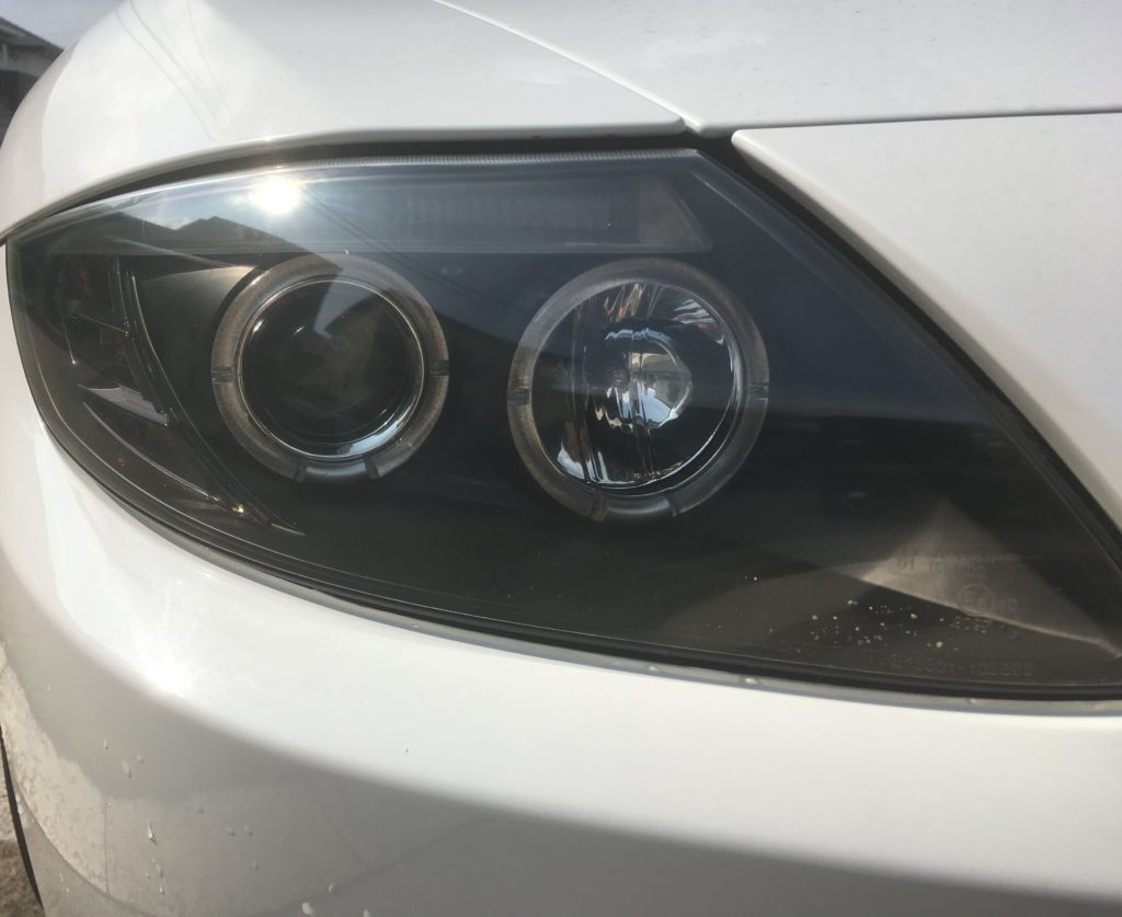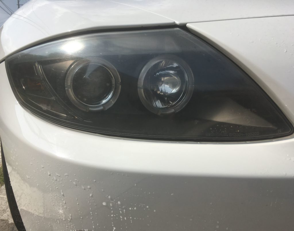 水で洗い流すと、ピカピカのヘッドライトがこんにちは。